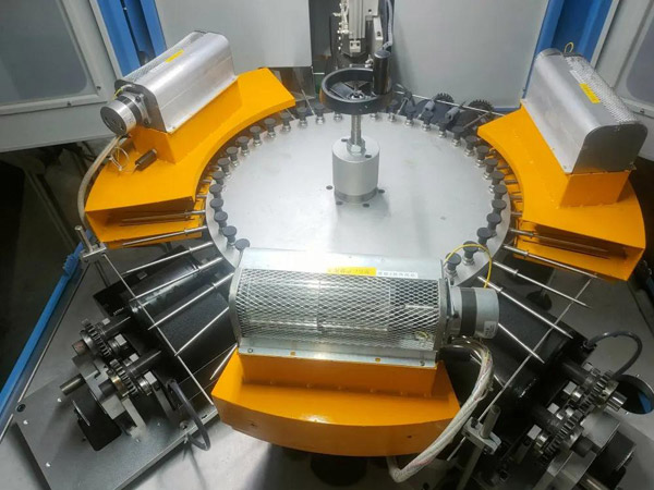 人工装料至输送盒→振动输送→预热通道对工件进行预热→自动上料→滚胶1→干燥1→滚胶2→干燥2→滚胶3→干燥3→下料→出料输送带将工件送入成品框。
